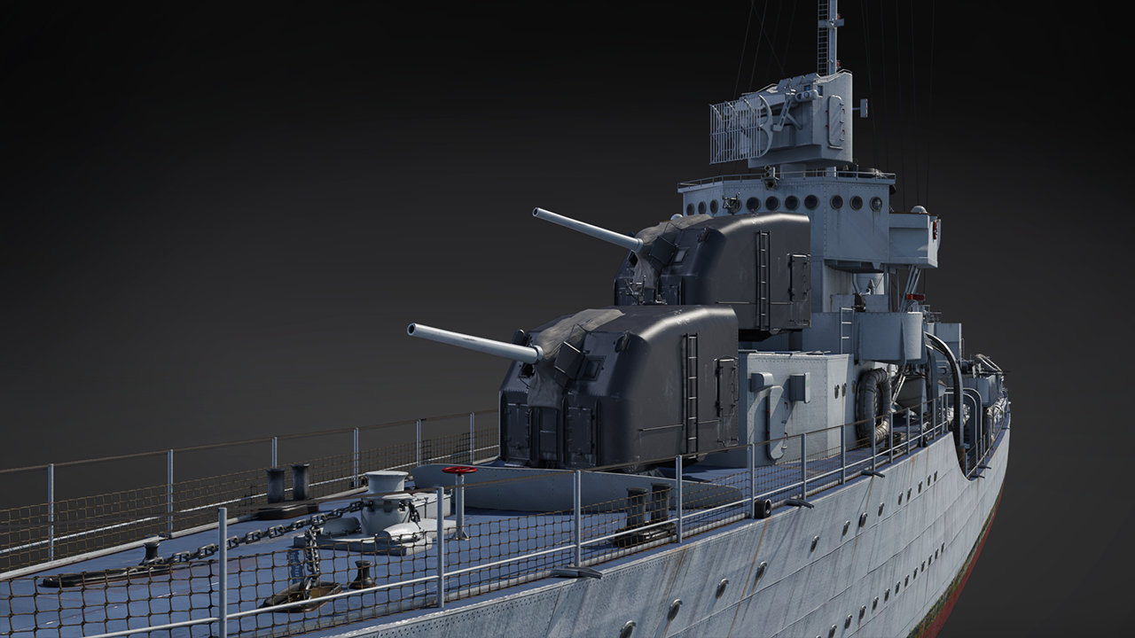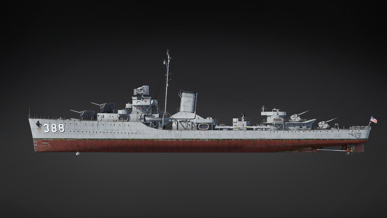 USS Helm is a member of the Bagley class, the lead ship of which is already available at rank II of the US Bluewater fleet. Helm will be arriving to the game in her 1944 configuration, from the period of the most intense combat in the Pacific Theater, featuring more diverse armament. Helm’s main battery consists of four 127 mm dual-purpose guns; the forward pair in enclosed single mounts, while the aft pair are in open mounts. These classic cannons have an excellent rate of fire, equipped with SAP and HE shells with contact fuzes, and proximity HE shells as well for aircraft. Speaking of anti-aircraft capabilities, Helm’s arsenal has been drastically improved! The lackluster machine guns have been replaced with automatic cannons: a twin 40 mm Bofors mount and six 20 mm Oerlikons. The torpedo armament is also particularly formidable, consisting of a pair of quadruple launchers on each side for a total of 16 compact Mk.15 torpedoes.