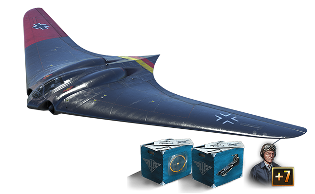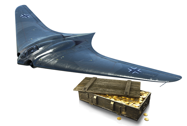 Horten Ho 229 to your Hangar! This flying wing aircraft has an awe-inspiring look, but there's more to it than that. Excellent speed and powerful boost allow it to move swiftly around the battlefield and quickly change altitude. Equipped with a pair of long-range 30 mm guns, this warbird is perfect for hunting big targets—it can destroy even a bomber in one pass!