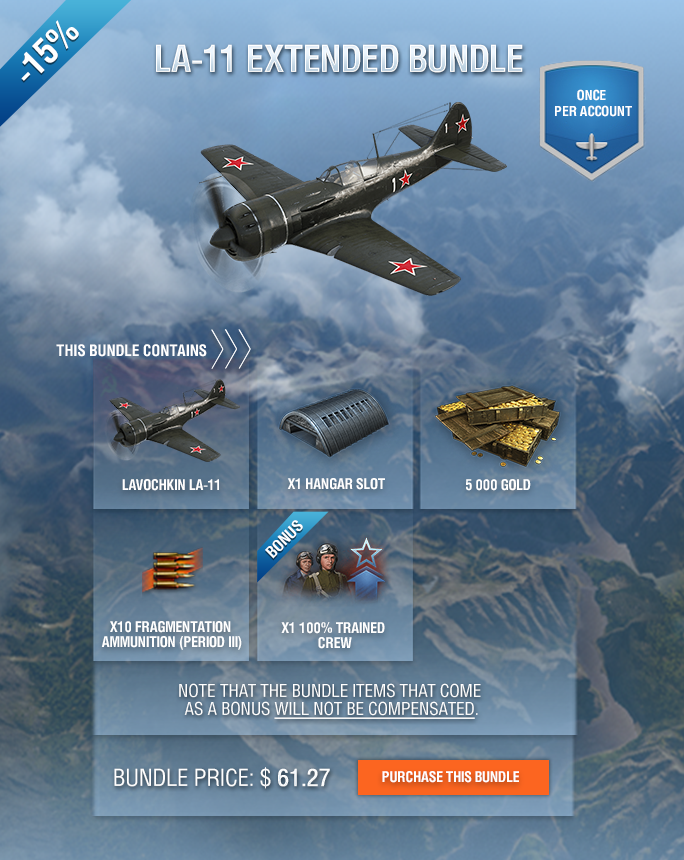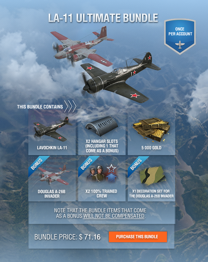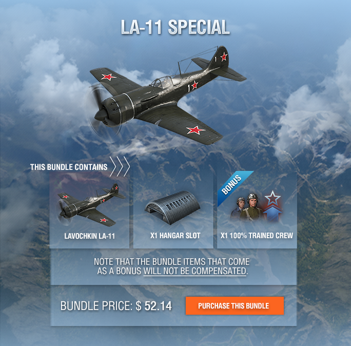 If you purchase a bundle with an aircraft that you already have, you will receive all the items from this bundle (gold, consumables, decoration set) except the Hangar slot, the crew, and the aircraft itself. Instead, you will be compensated with the following amount of gold: