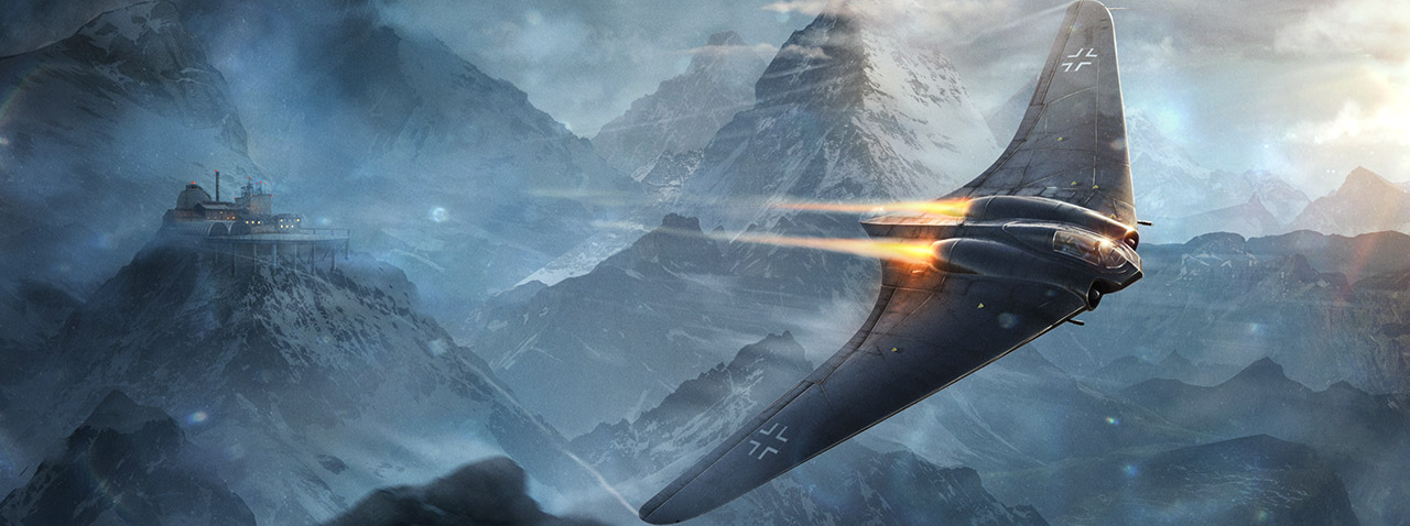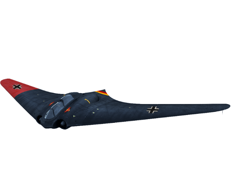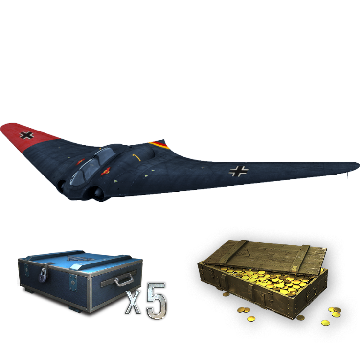 Horten Ho 229 for your Hangar! A very impressive aircraft, constructed according to the "flying wing" scheme, which boasts more than just a great exterior. The fantastic speed performance and powerful boost allow it to move swiftly around the battlefield and quickly change altitude range. A pair of long-range 30 mm guns make this warbird a perfect hunter of almost any target – its sniper fire allows it to destroy even a bomber in one pass!