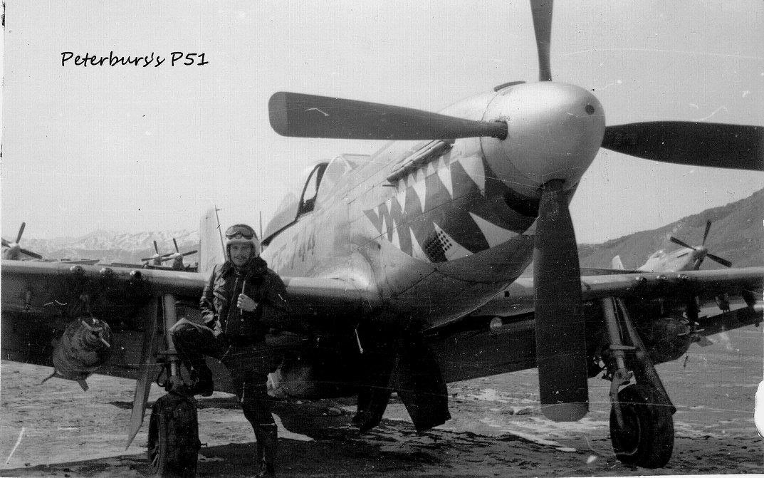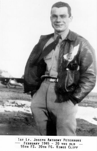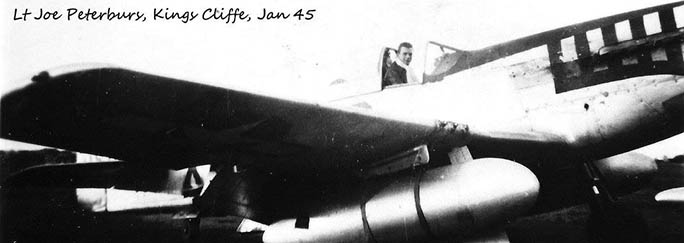 Joe Peterburs joined the US Army Air Corps in November 1942, and became an aviation cadet in January 1943. After training as a fighter pilot on the A-24 Banshee and P-40N Kittyhawk, he was deployed to England. Arriving at Kings Cliffe RAF station on November 6, 1944, 19-year-old Lt. Peterburs was assigned to the 55th Fighter Wing of the 20th Fighter Group.